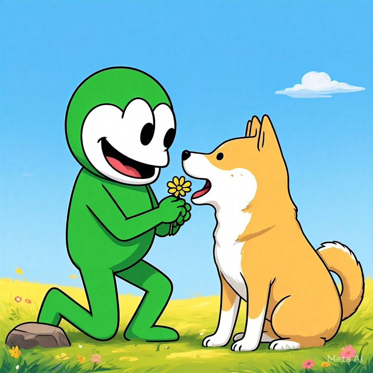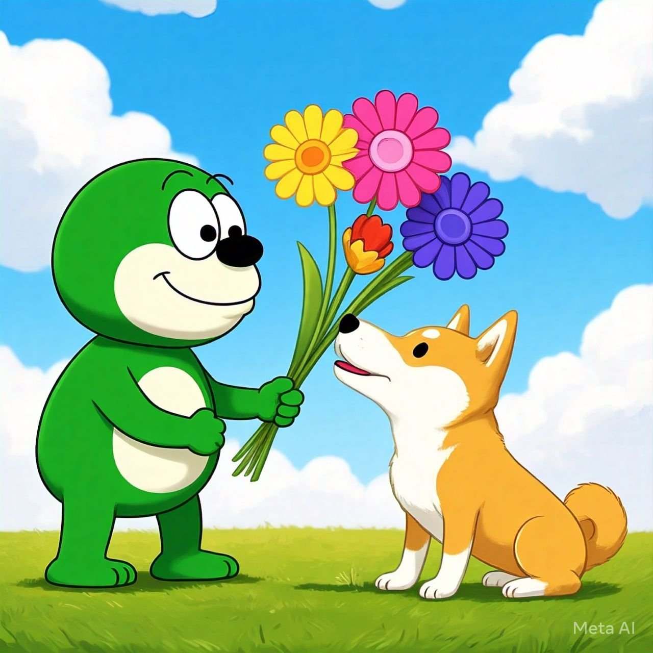 Sheba, a gentle golden retriever, was resting in the park when Pepe, a cheerful French bulldog, ran up to her with a flower in his mouth. Sheba smiled, and from that moment, they knew they were meant to be.